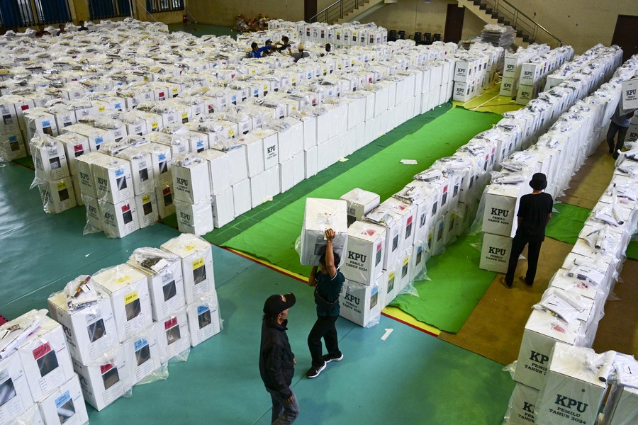 Staff members carry ballot boxes during the distribution of election materials ahead of general elections in Jakarta, Indonesia, Feb. 13, 2024. (Xinhua/Zulkarnain)