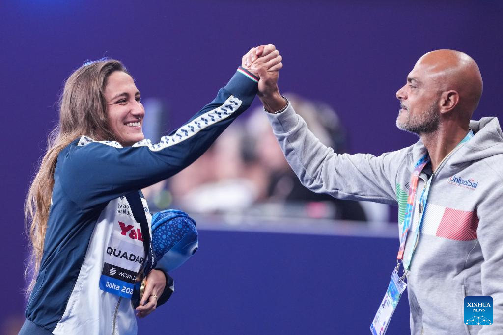 Gold medalist Simona Quadarella (L) of Italy celebrates after the awarding ceremony for the women's 1500m freestyle of swimming event at the World Aquatics Championships 2024 in Doha, Qatar, Feb. 13, 2024. (Xinhua/Du Yu)