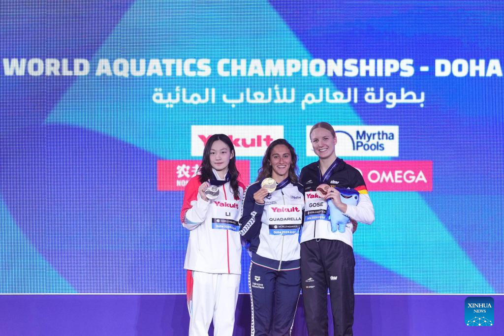 Silver medalist Li Bingjie (L) of China, gold medalist Simona Quadarella (C) of Italy and bronze medalist Isabel Gose of Germany pose during the awarding ceremony for the women's 1500m freestyle of swimming event at the World Aquatics Championships 2024 in Doha, Qatar, Feb. 13, 2024. (Xinhua/Du Yu)