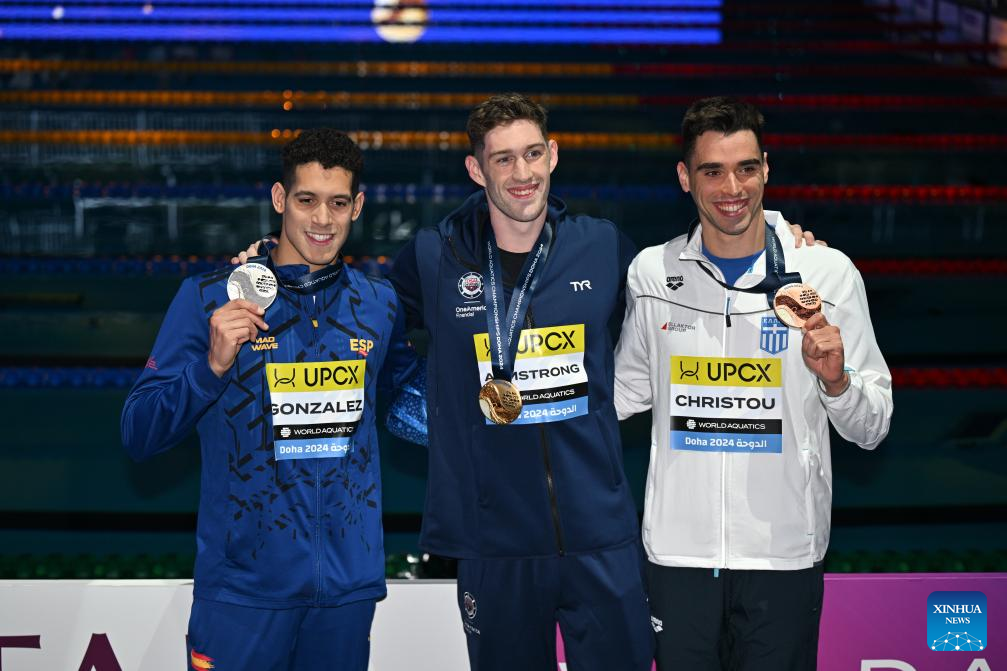 Gold medalist Hunter Armstrong (C) of the United States, silver medalist Hugo Gonzalez (L) of Spain and bronze medalist Apostolos Christou of Greece pose after the awarding ceremony for the men's 100m backstroke of swimming event at the World Aquatics Championships 2024 in Doha, Qatar, Feb. 13, 2024. (Xinhua/Xue Yuge)