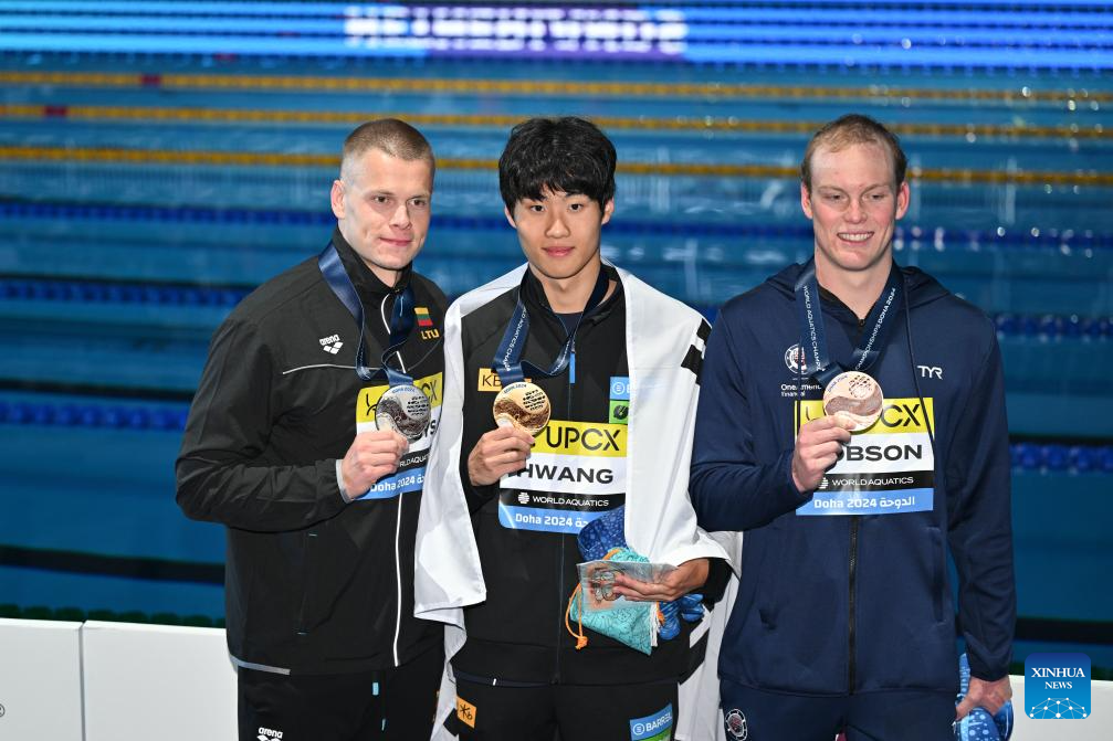 Gold medalist Hwang Sunwoo (C) of South Korea, silver medalist Danas Rapsys (L) of Lithuania and bronze medalist Luke Hobson of the United States pose during the awarding ceremony for the men's 200m freestyle of swimming event at the World Aquatics Championships 2024 in Doha, Qatar, Feb. 13, 2024. (Xinhua/Xue Yuge)