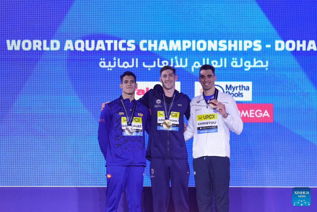 Gold medalist Hunter Armstrong (C) of the United States, silver medalist Hugo Gonzalez (L) of Spain and bronze medalist Apostolos Christou of Greece pose during the awarding ceremony for the men's 100m backstroke of swimming event at the World Aquatics Championships 2024 in Doha, Qatar, Feb. 13, 2024. (Xinhua/Du Yu)