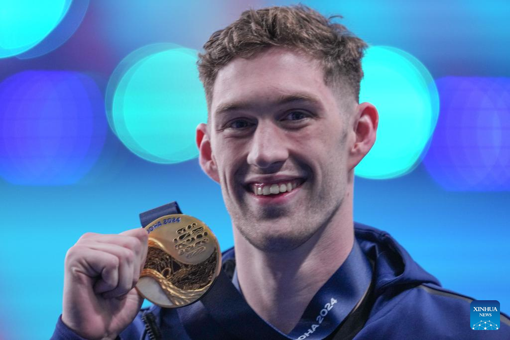 Gold medalist Hunter Armstrong of the United States celebrates after the awarding ceremony for the men's 100m backstroke of swimming event at the World Aquatics Championships 2024 in Doha, Qatar, Feb. 13, 2024. (Xinhua/Du Yu)