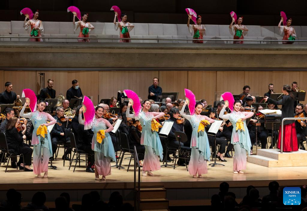 Dressed-up dancers perform while the Toronto Symphony Orchestra plays "Flower Drum Song from Feng Yang" from Folk Songs for Orchestra at Roy Thomson Hall in Toronto, Canada, Feb. 13, 2024. A concert in celebration of the Chinese New Year of the Dragon was held here by the Toronto Symphony Orchestra on Tuesday. (Photo by Zou Zheng/Xinhua)