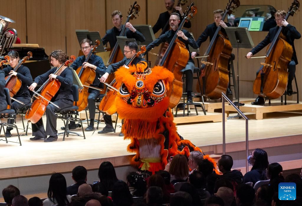 Lion dancers perform while the Toronto Symphony Orchestra plays "Welcoming Spring" at Roy Thomson Hall in Toronto, Canada, Feb. 13, 2024. A concert in celebration of the Chinese New Year of the Dragon was held here by the Toronto Symphony Orchestra on Tuesday. (Photo by Zou Zheng/Xinhua)