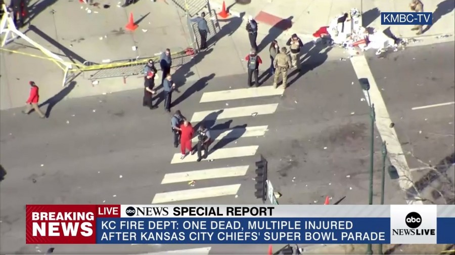 The screenshot taken from the live streaming of ABC News shows the scene where several people were shot as gunfire erupted during the Kansas City Chiefs' Super Bowl victory parade in Kansas City, U.S. state of Missouri, Feb. 14, 2024. (Xinhua)