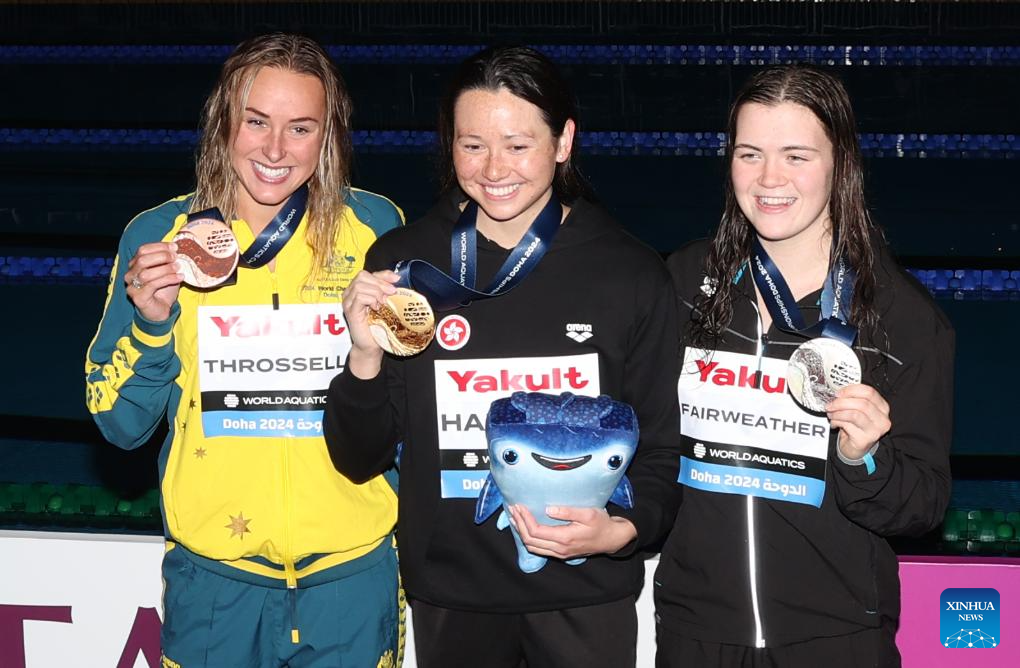 Bronze medalist Brianna Throssell of Australia, gold medalist Siobhan Bernadette Haughey of China's Hong Kong and silver medalist Erika Fairweather of New Zealand (L to R) pose for photos after the awarding ceremony for the women's 200m freestyle of swimming event at the World Aquatics Championships 2024 in Doha, Qatar, Feb. 14, 2024. (Xinhua/Luo Yuan)