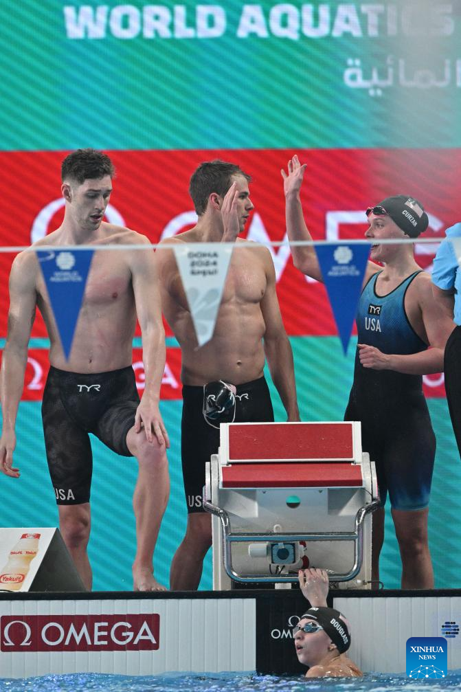 Nic Fink (C) of Team the United States competes during the mixed 4X100m medley relay final of swimming event at the World Aquatics Championships 2024 in Doha, Qatar, Feb. 14, 2024. (Xinhua/Xia Yifang)