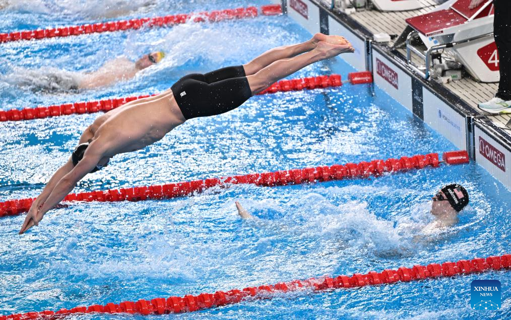 Hunter Armstrong of Team the United States competes during the mixed 4X100m medley relay final of swimming event at the World Aquatics Championships 2024 in Doha, Qatar, Feb. 14, 2024. (Xinhua/Xue Yuge)