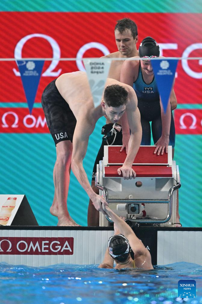 Hunter Armstrong (top, L) and Kate Douglass (bottom) of Team the United States celebrate after the mixed 4X100m medley relay final of swimming event at the World Aquatics Championships 2024 in Doha, Qatar, Feb. 14, 2024. (Xinhua/Xue Yuge)