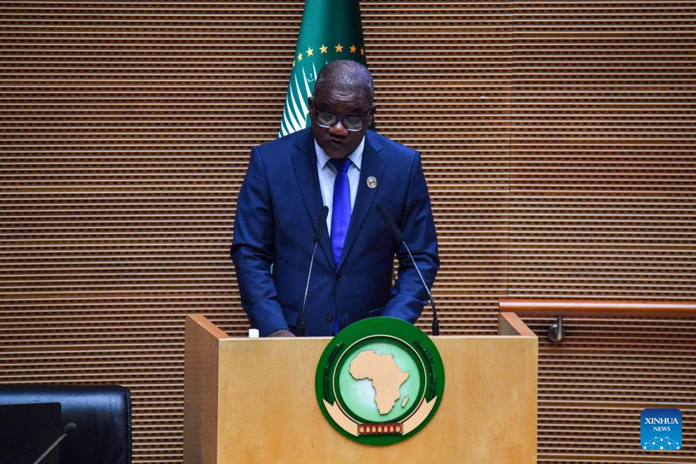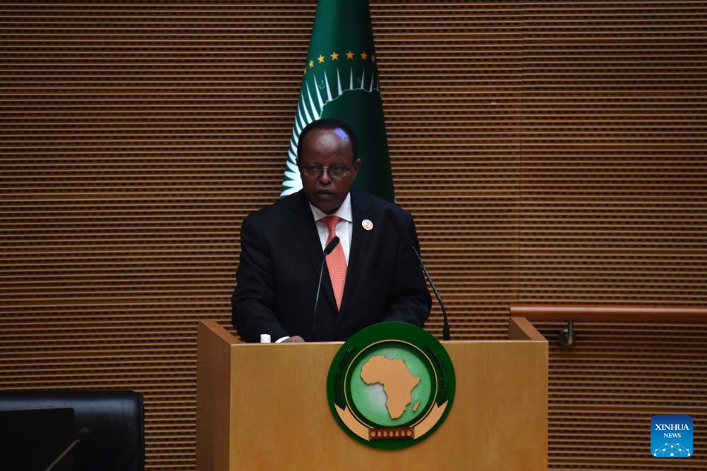 Dhoihir Dhoulkamal, minister of Foreign Affairs and International Cooperation of Comoros and the chairperson of the AU Executive Council for 2023, addresses the executive council meeting at the African Union headquarters in Addis Ababa, Ethiopia, on Feb. 14, 2024. The 44th Ordinary Session of the Executive Council of the African Union (AU) began Wednesday at the AU headquarters in Addis Ababa, with a call for increasing efforts to ensure continental stability and quality education in Africa. (Xinhua/Michael Tewelde)