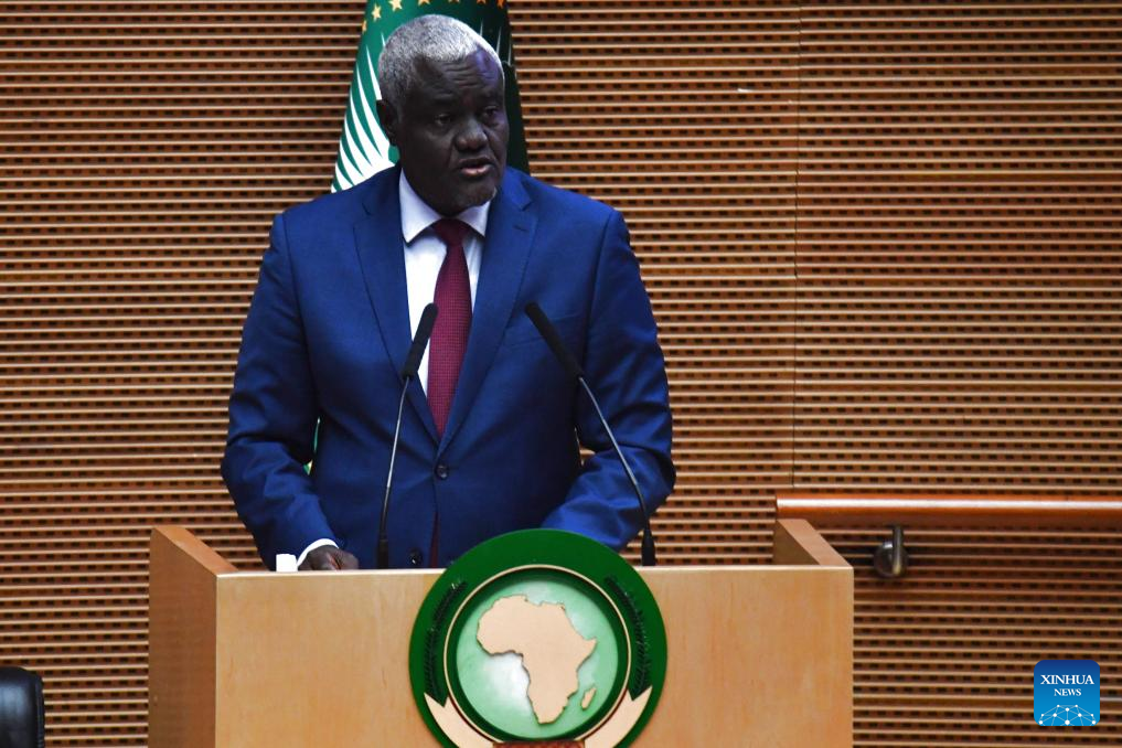 Chairperson of the African Union (AU) Commission Moussa Faki Mahamat addresses the executive council meeting at the AU headquarters in Addis Ababa, Ethiopia on Feb. 14, 2024.