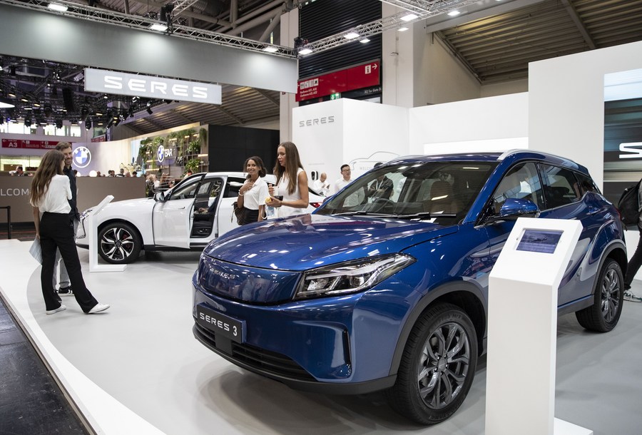 This photo shows the booth of Chinese carmaker SERES during the media preview of the 2023 International Motor Show, officially known as the IAA MOBILITY 2023, in Munich, Germany, Sept. 4, 2023. (Xinhua/Zhang Fan)