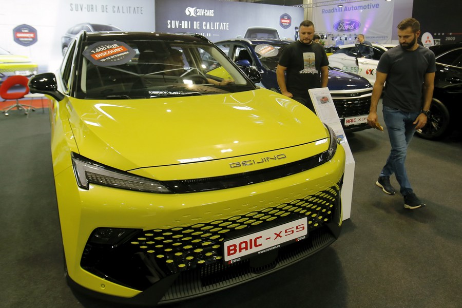 Visitors look at a BAIC X55 car during the 20th edition of Bucharest Car Show 2023 (SAB) in Bucharest, Romania, Oct. 12, 2023. (Photo by Cristian Cristel/Xinhua)