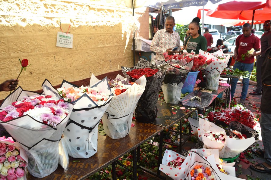 NAIROBI, Feb. 15 (Xinhua) -- Undeterred by the scorching heat that enveloped the downtown business district of the Kenyan capital of Nairobi, a large crowd milled around Ann Mungai's flower shop Wednesday afternoon, drawn by the aroma of fresh red roses.