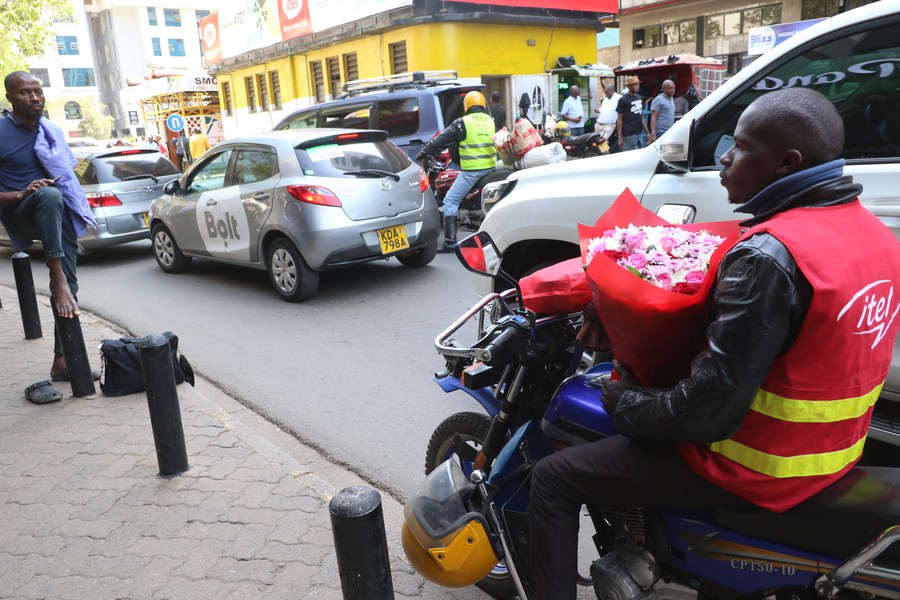 A motorcycle rider prepares to deliver flowers to a client in Nairobi, the capital of Kenya, on Feb. 14, 2024. (Photo by Allan Mutiso/Xinhua)