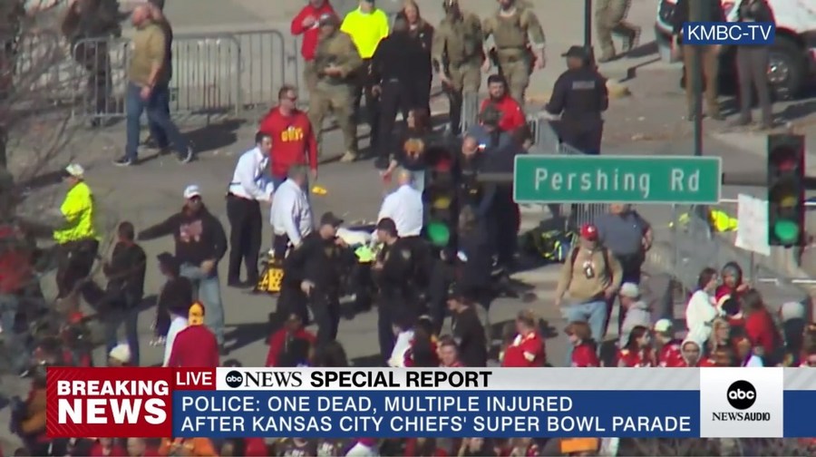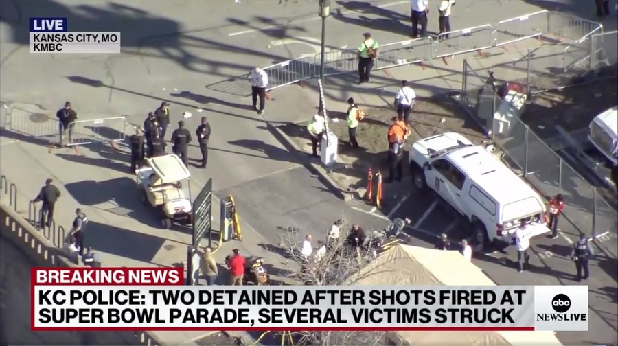 The screenshot taken from the live streaming of ABC News shows the scene where several people were shot as gunfire erupted during the Kansas City Chiefs' Super Bowl victory parade in Kansas City, U.S. state of Missouri, Feb. 14, 2024. (Xinhua)