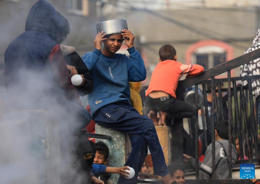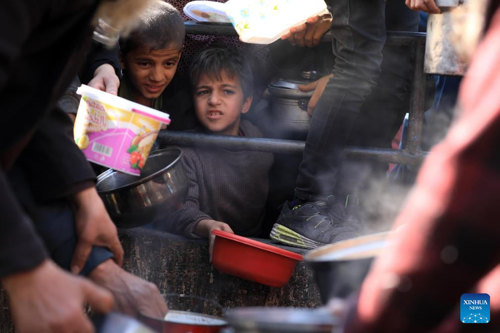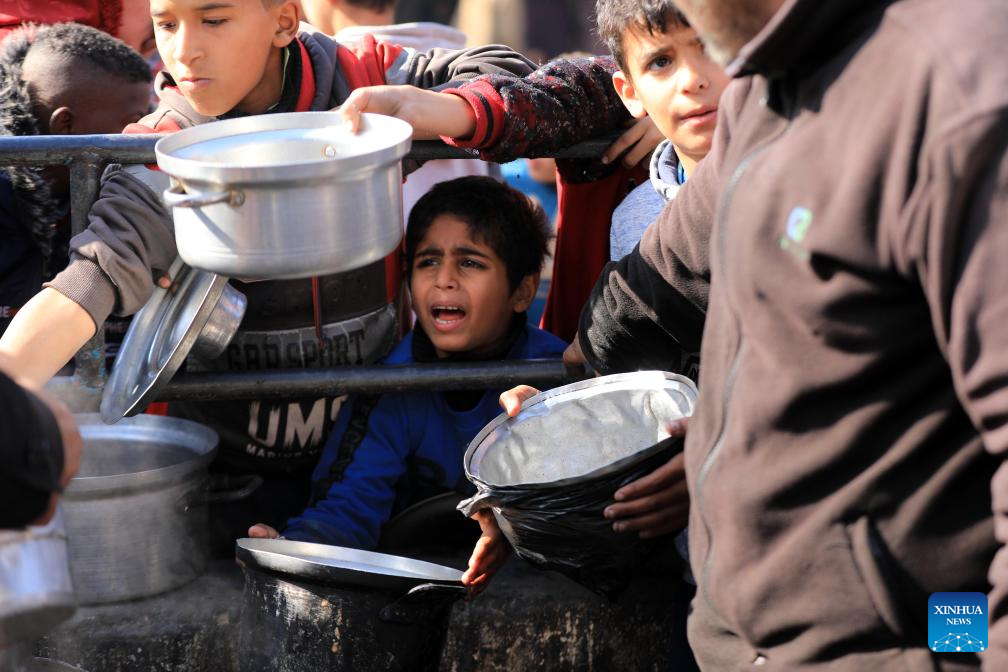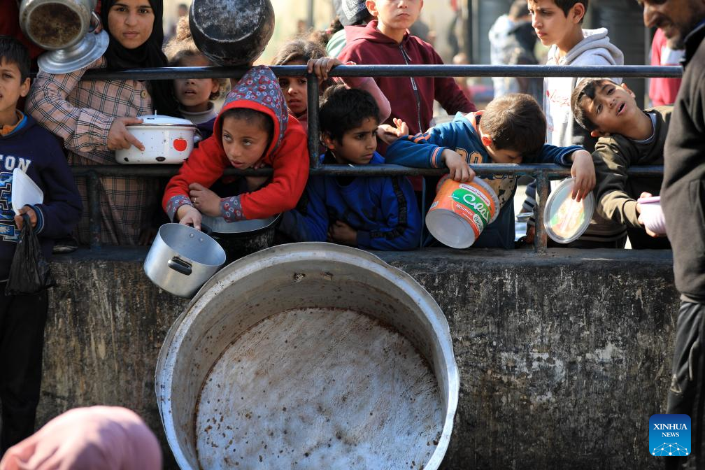 Palestinians wait for relief food supplies in the southern Gaza Strip city of Rafah, on Feb. 14, 2024. The World Health Organization (WHO) on Wednesday warned of an "unfathomable catastrophe" that the potential expansion of Israeli ground assault could cause in Rafah, a city in the southern Gaza Strip. (Photo by Yasser Qudih/Xinhua)
