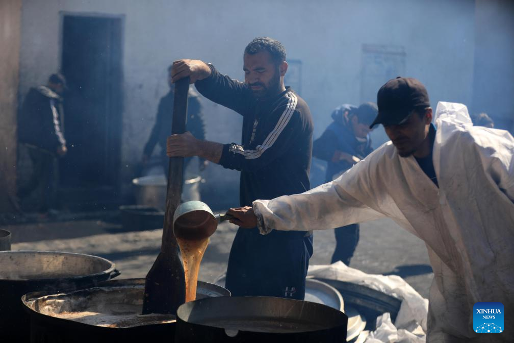 Palestinian volunteers prepare food for displaced people in the southern Gaza Strip city of Rafah, on Feb. 14, 2024. The World Health Organization (WHO) on Wednesday warned of an "unfathomable catastrophe" that the potential expansion of Israeli ground assault could cause in Rafah, a city in the southern Gaza Strip. (Photo by Yasser Qudih/Xinhua)