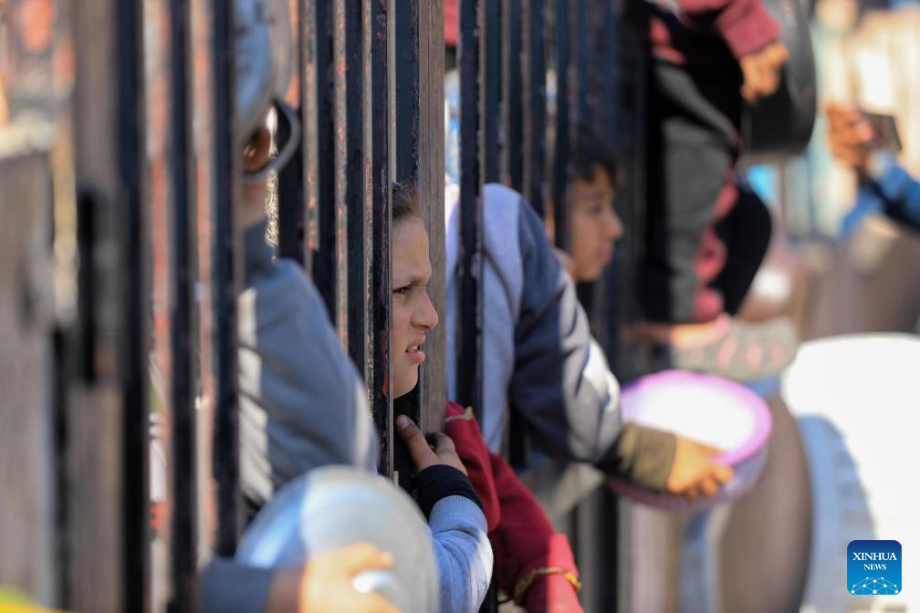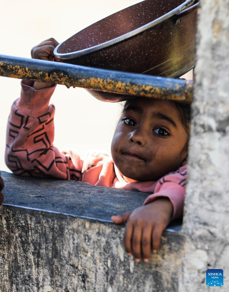 A Palestinian girl waits for relief food supplies in the southern Gaza Strip city of Rafah, on Feb. 14, 2024. The World Health Organization (WHO) on Wednesday warned of an "unfathomable catastrophe" that the potential expansion of Israeli ground assault could cause in Rafah, a city in the southern Gaza Strip. (Photo by Yasser Qudih/Xinhua)