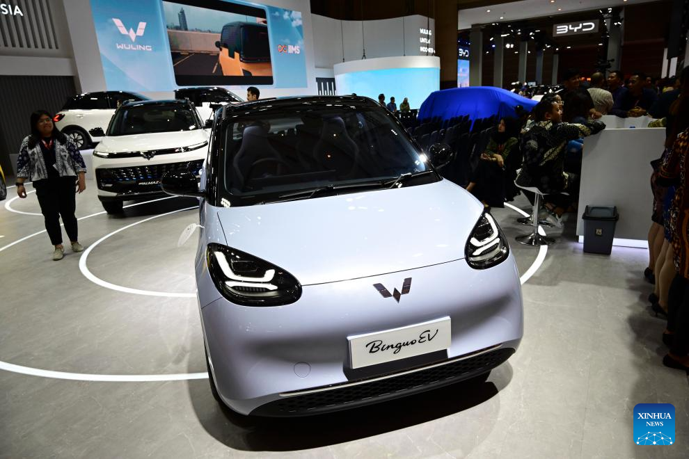 This photo taken on Feb. 15, 2024 shows a scene at the booth of Chinese automaker Wuling during the Indonesia International Motor Show 2024 at Jakarta International Expo in Jakarta, Indonesia. The exhibition kicked off here on Thursday and will last until Feb. 25. (Xinhua/Zulkarnain)