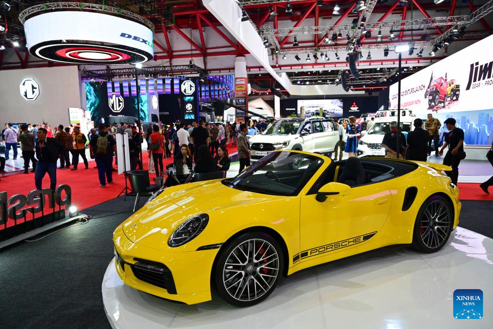 A Porsche car is exhibited during the Indonesia International Motor Show 2024 at Jakarta International Expo in Jakarta, Indonesia, Feb. 15, 2024. The exhibition kicked off here on Thursday and will last until Feb. 25. (Xinhua/Zulkarnain)
