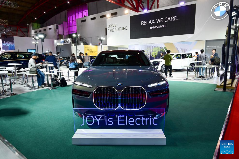 This photo taken on Feb. 15, 2024 shows a scene at the booth of German automaker BMW during the Indonesia International Motor Show 2024 at Jakarta International Expo in Jakarta, Indonesia. The exhibition kicked off here on Thursday and will last until Feb. 25. (Xinhua/Zulkarnain)