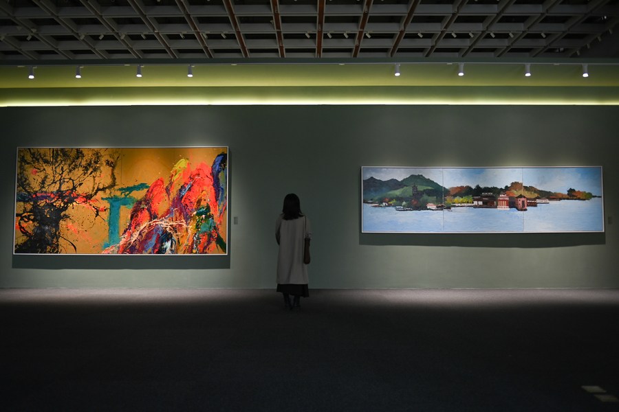 A woman visits the art exhibition of "Silk Road Artists' Rendezvous" in Hangzhou, capital of east China's Zhejiang Province, Dec. 3, 2023. (Xinhua/Huang Zongzhi)