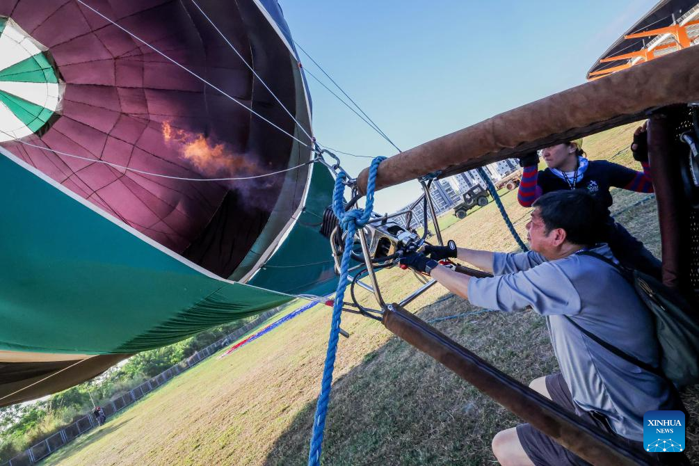 Aviators prepare to fly a hot air balloon during the 24th Philippine International Hot Air Balloon Fiesta in Tarlac Province, the Philippines, on Feb. 16, 2024. The 24th Philippine International Hot Air Balloon Fiesta will be held here from Feb. 16 to 18 to showcase hot air balloons and hold many aerial activities. (Xinhua/Rouelle Umali)