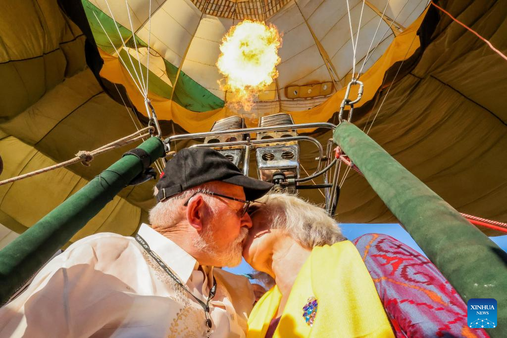 A couple kiss while on board a hot air balloon during the 24th Philippine International Hot Air Balloon Fiesta in Tarlac Province, the Philippines, on Feb. 16, 2024. The 24th Philippine International Hot Air Balloon Fiesta will be held here from Feb. 16 to 18 to showcase hot air balloons and hold many aerial activities. (Xinhua/Rouelle Umali)