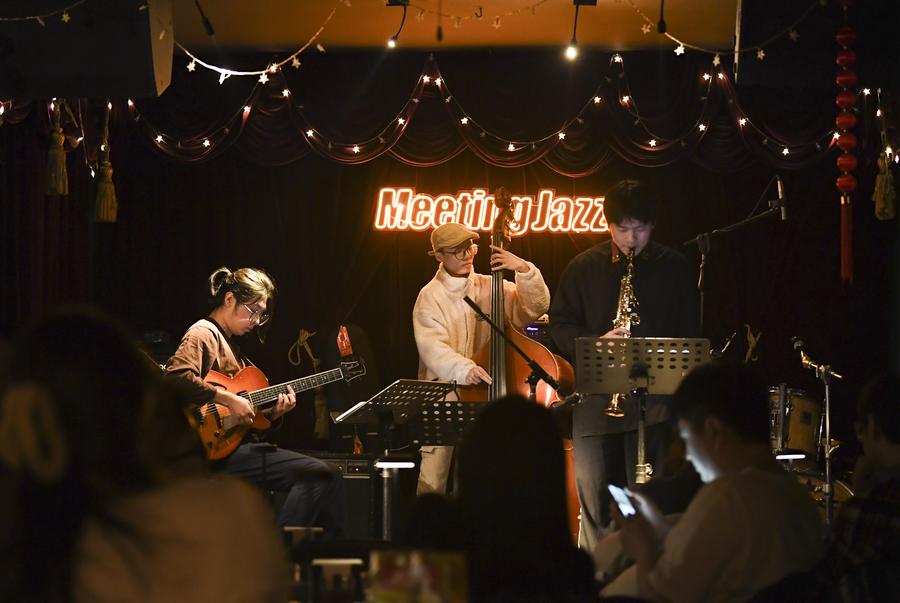 People enjoy a jazz performance at a club in Xi'an, northwest China's Shaanxi Province, Feb. 13, 2024. (Xinhua/Li Yibo)