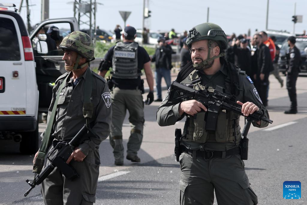 Israeli security forces investigate the scene after a shooting attack at a bus stop near the southern Israeli city of Kiryat Malakhi, on Feb. 16, 2024. The shooting attack in southern Israel killed two people and injured four others on Friday afternoon, according to Israeli police and emergency services. (Ilan Assayag/JINI via Xinhua)