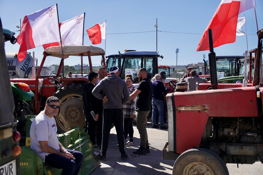 Farmers participate in a protest in Ta'Qali, Malta, on Feb. 15, 2024. (Photo by Jonathan Borg/Xinhua)