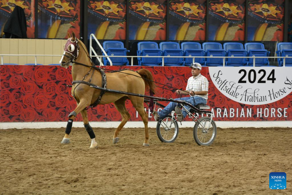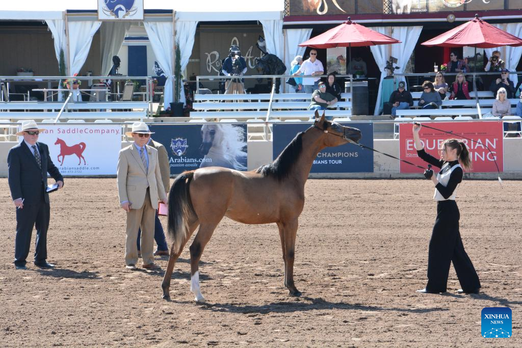 An Arabian horse is seen in a beauty pageant during the Scottsdale Arabian Horse Show in Scottsdale, Arizona, the United States, on Feb. 15, 2024. The Scottsdale Arabian Horse Show is held here from Feb. 15 to Feb. 25, featuring competitions among Arabian horses, a shopping expo and more. (Photo by Sui Xuguang/Xinhua)