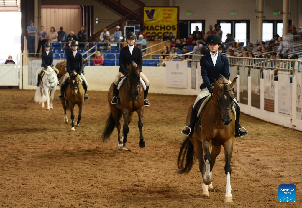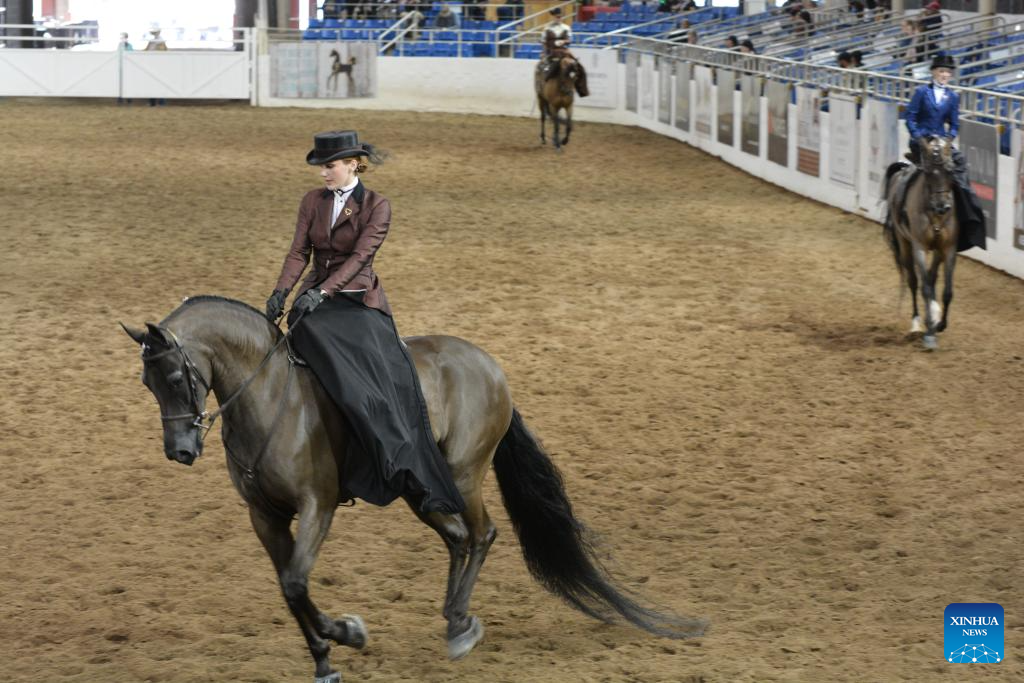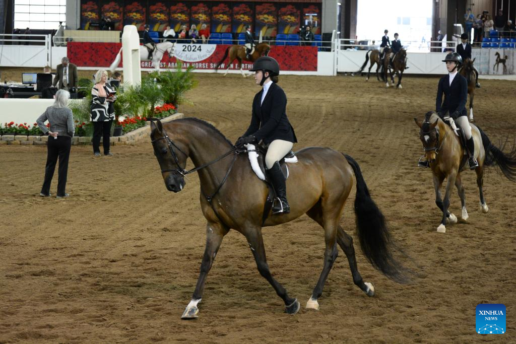 Riders compete in an equestrian competition during the Scottsdale Arabian Horse Show in Scottsdale, Arizona, the United States, on Feb. 15, 2024. The Scottsdale Arabian Horse Show is held here from Feb. 15 to Feb. 25, featuring competitions among Arabian horses, a shopping expo and more. (Photo by Sui Xuguang/Xinhua)