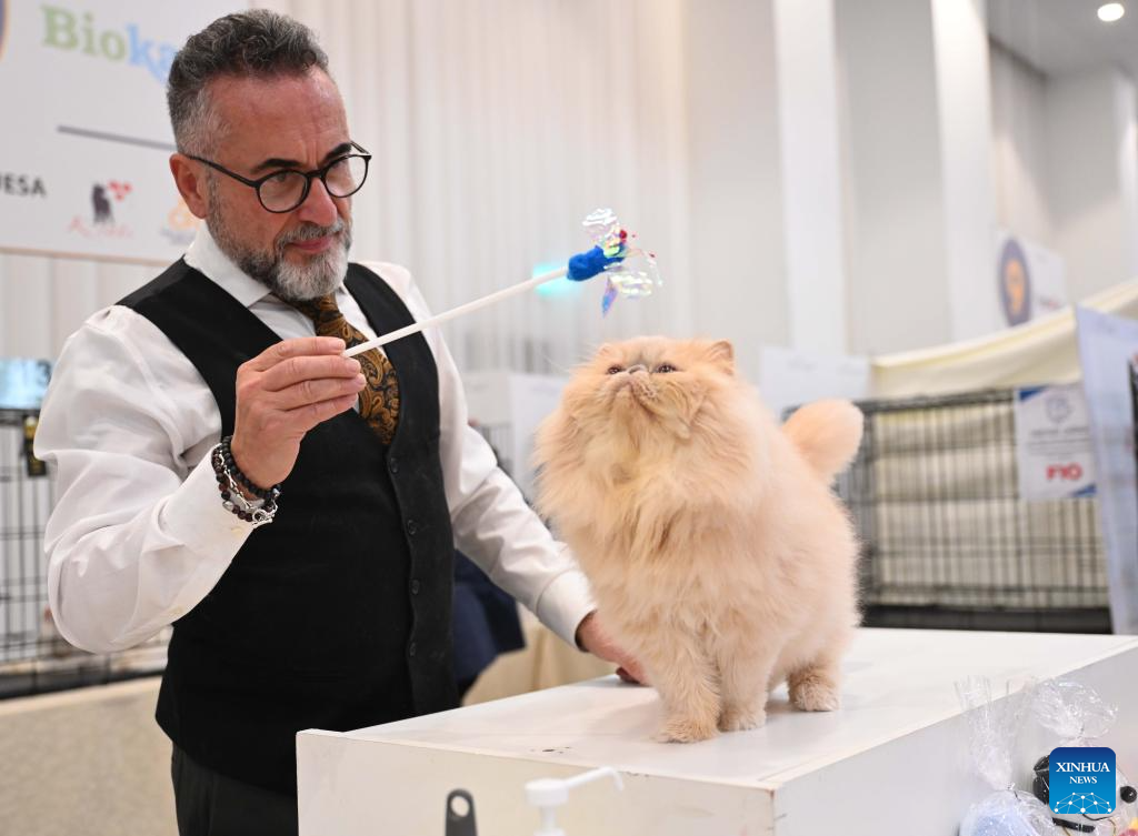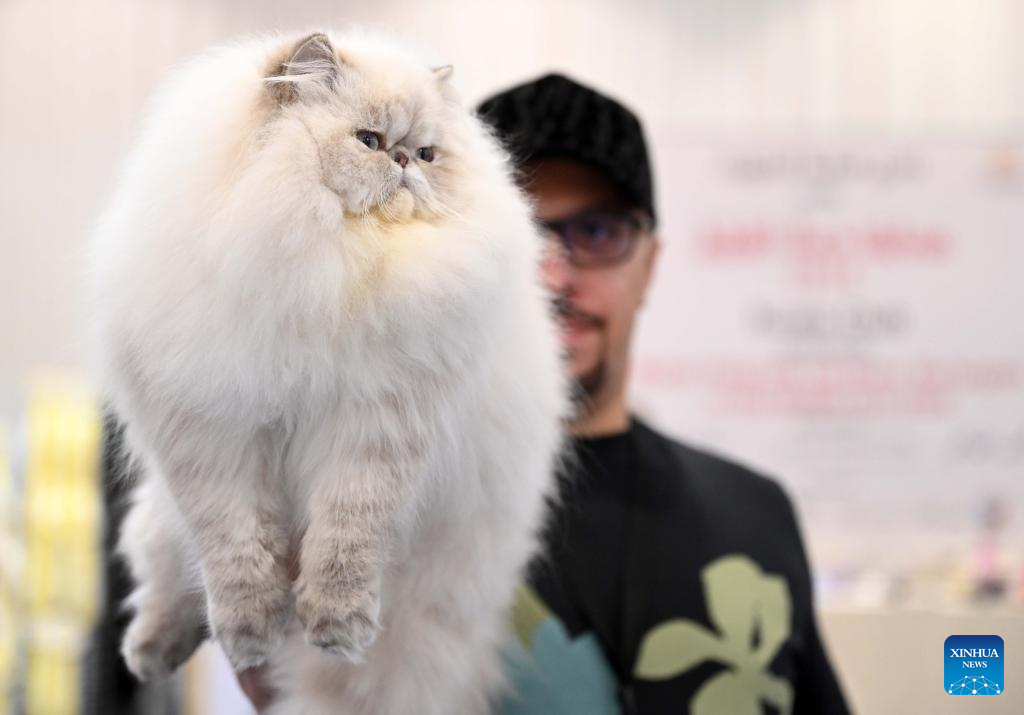 A judge teases a cat during the KCATS SHOW 2024 in Hawalli Governorate, Kuwait, Feb. 17, 2024. (Photo by Asad/Xinhua)
