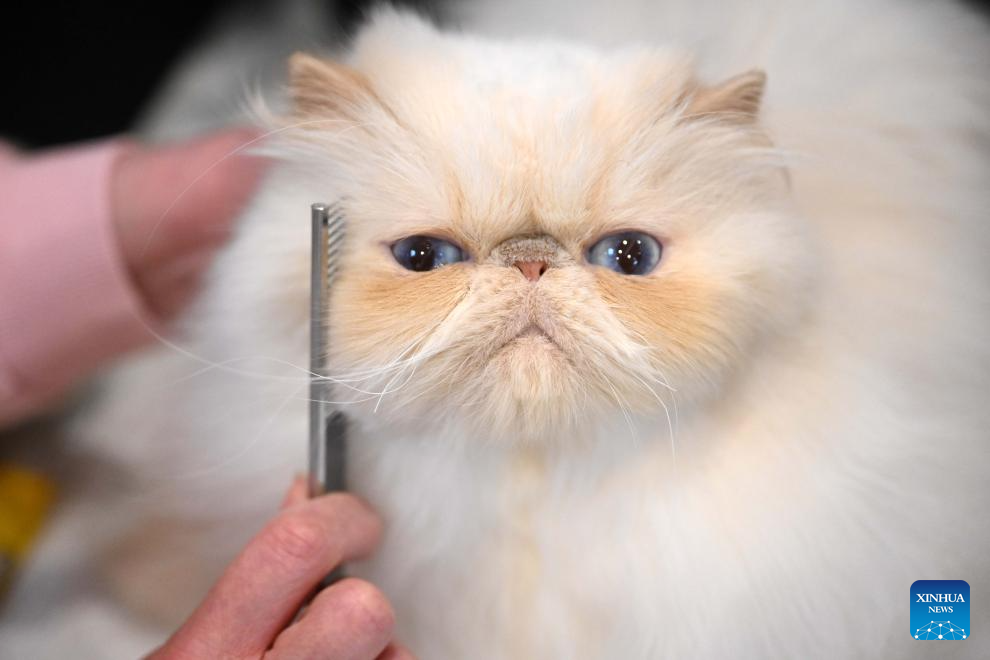 A cat has its hair combed during the KCATS SHOW 2024 in Hawalli Governorate, Kuwait, Feb. 17, 2024. (Photo by Asad/Xinhua)
