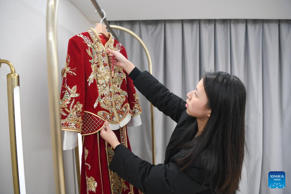 A staff member arranges a wedding dress at a store in a cultural industrial park in Liangjiang New Area, southwest China's Chongqing Municipality, Feb. 15, 2024. In recent years, various urban renewal measures have been taken in Chongqing to transform old streets, old factories, old buildings into tourism attractions, the gathering place for emerging industries etc. (Xinhua/Wang Quanchao)