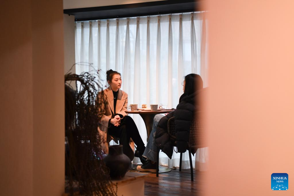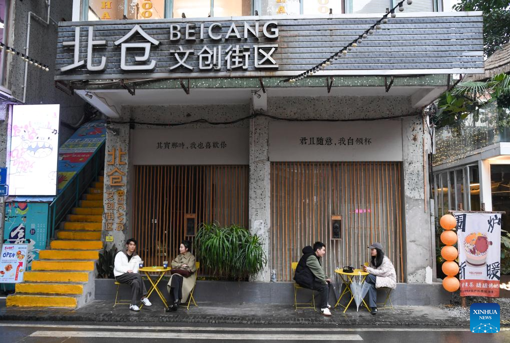 People chat at a cafe in a cultural industrial park in Liangjiang New Area, southwest China's Chongqing Municipality, Feb. 15, 2024. In recent years, various urban renewal measures have been taken in Chongqing to transform old streets, old factories, old buildings into tourism attractions, the gathering place for emerging industries etc. (Xinhua/Wang Quanchao)