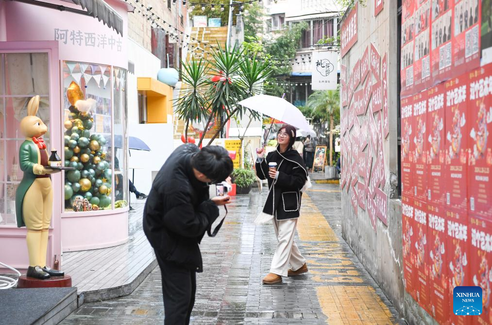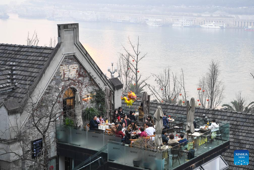 People enjoy themselves at the Beicang Cultural and Creative Block in Jiangbei District of southwest China's Chongqing Municipality, Feb. 15, 2024. In recent years, various urban renewal measures have been taken in Chongqing to transform old streets, old factories, old buildings into tourism attractions, the gathering place for emerging industries etc. (Xinhua/Wang Quanchao)