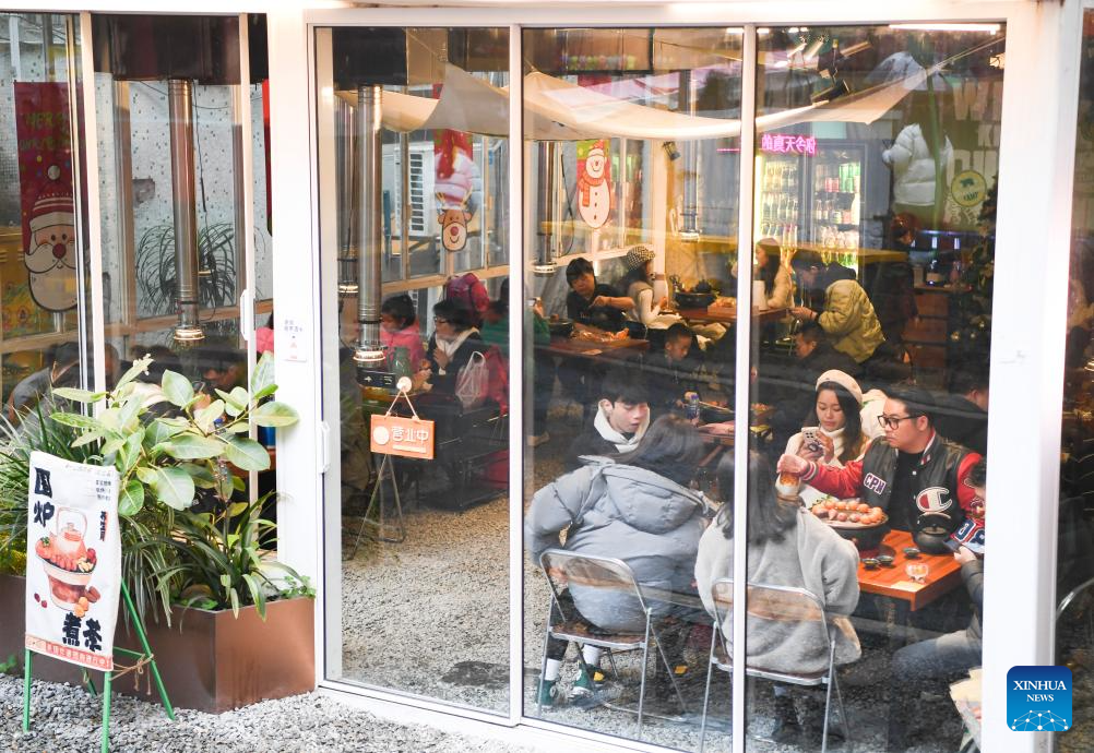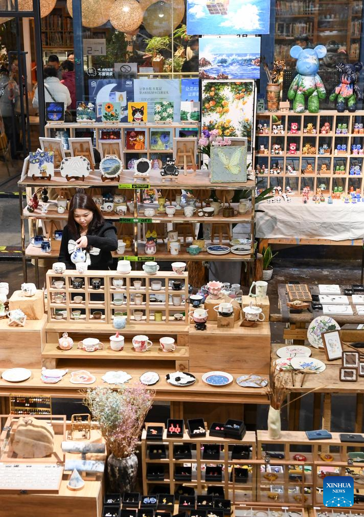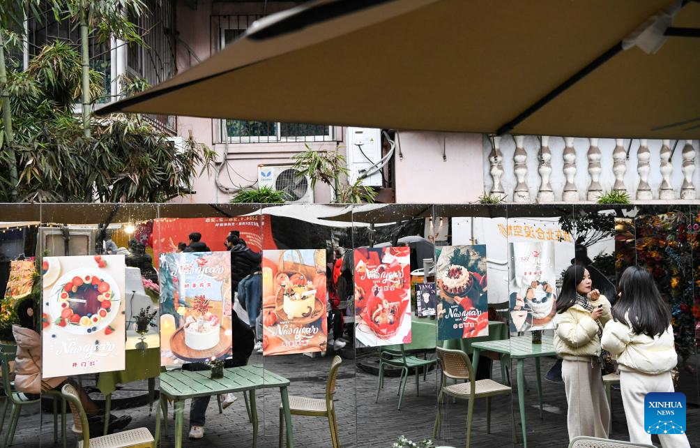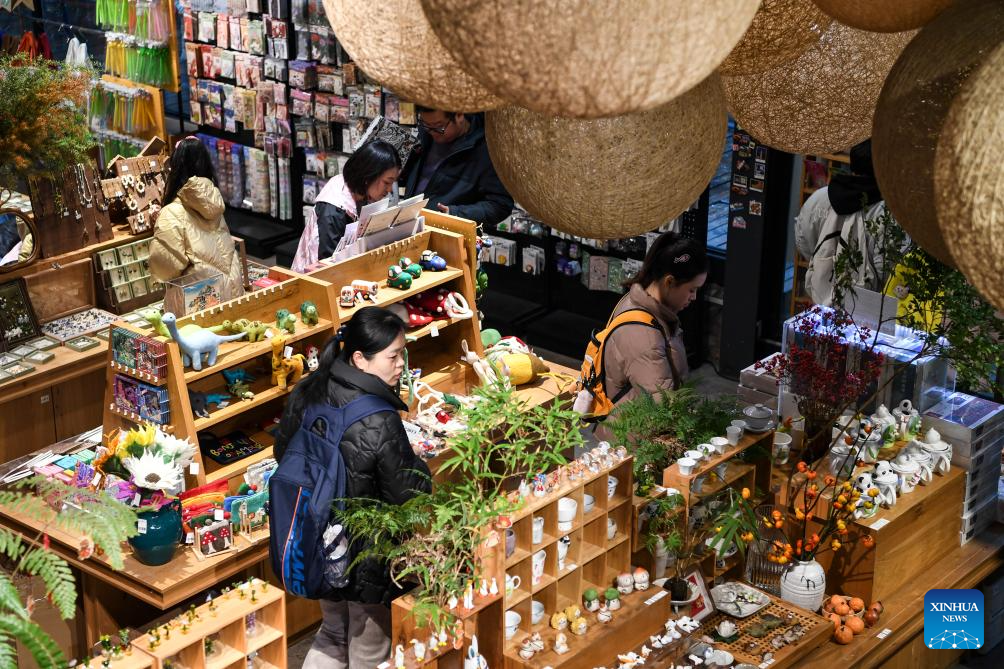 People shop at the Beicang Cultural and Creative Block in Jiangbei District of southwest China's Chongqing Municipality, Feb. 15, 2024. In recent years, various urban renewal measures have been taken in Chongqing to transform old streets, old factories, old buildings into tourism attractions, the gathering place for emerging industries etc. (Xinhua/Wang Quanchao)