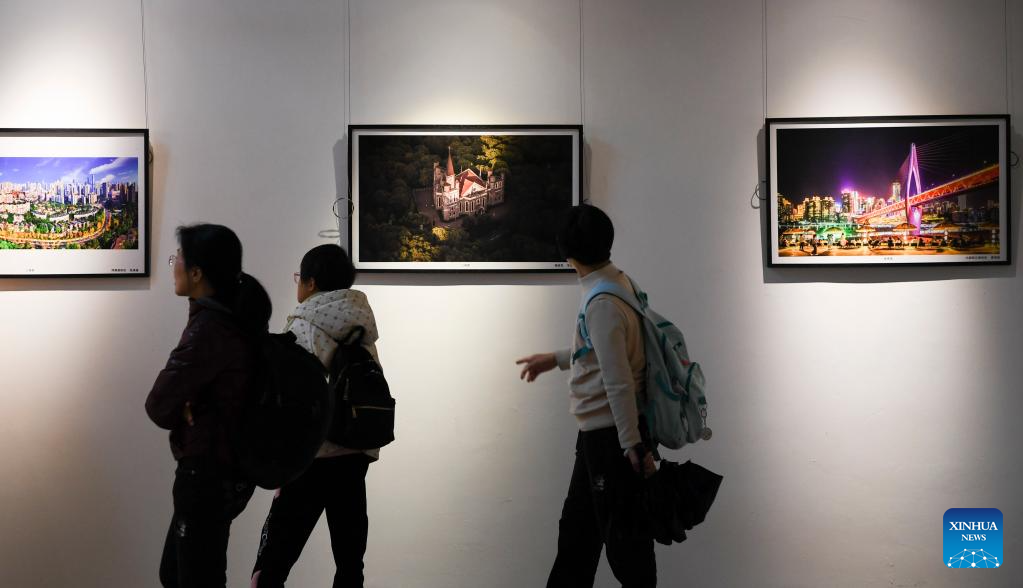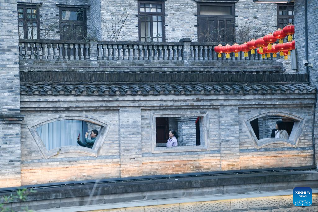 People visit a photography exhibition at the Beicang Cultural and Creative Block in Jiangbei District of southwest China's Chongqing Municipality, Feb. 15, 2024. In recent years, various urban renewal measures have been taken in Chongqing to transform old streets, old factories, old buildings into tourism attractions, the gathering place for emerging industries etc. (Xinhua/Wang Quanchao)