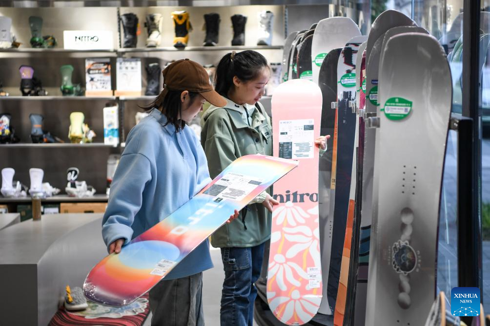 People shop for snowboards at a cultural industrial park in Liangjiang New Area, southwest China's Chongqing Municipality, Feb. 15, 2024. In recent years, various urban renewal measures have been taken in Chongqing to transform old streets, old factories, old buildings into tourism attractions, the gathering place for emerging industries etc. (Xinhua/Wang Quanchao)