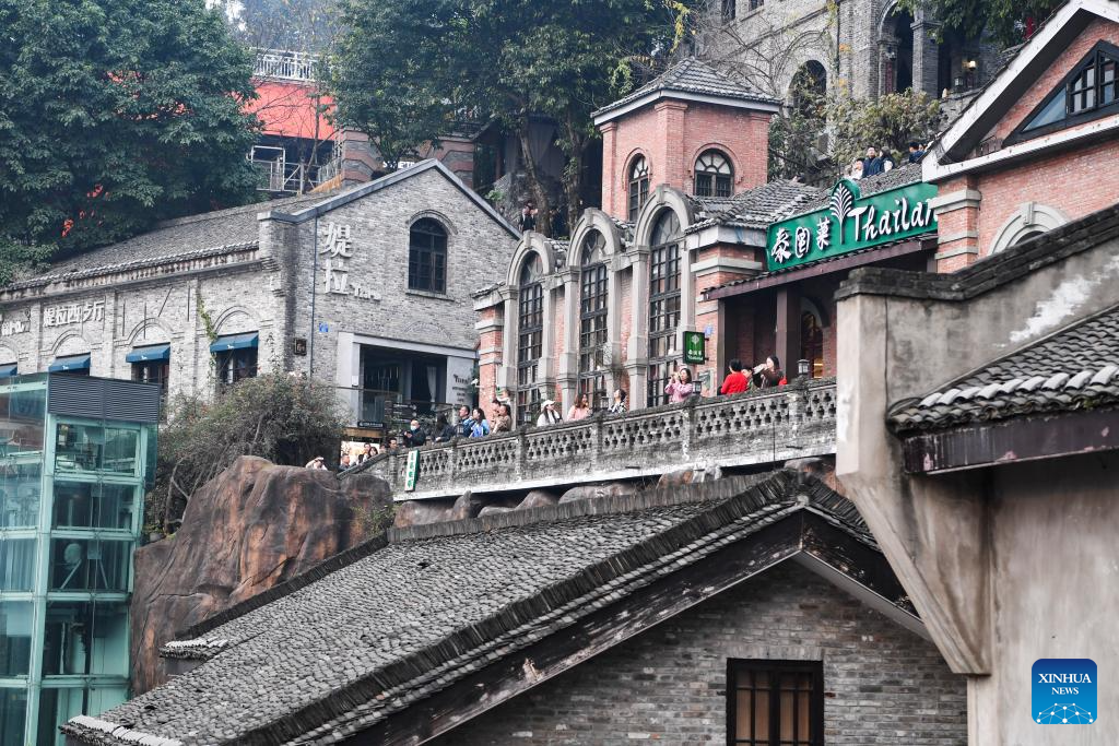 People visit the Beicang Cultural and Creative Block in Jiangbei District of southwest China's Chongqing Municipality, Feb. 15, 2024. In recent years, various urban renewal measures have been taken in Chongqing to transform old streets, old factories, old buildings into tourism attractions, the gathering place for emerging industries etc. (Xinhua/Wang Quanchao)