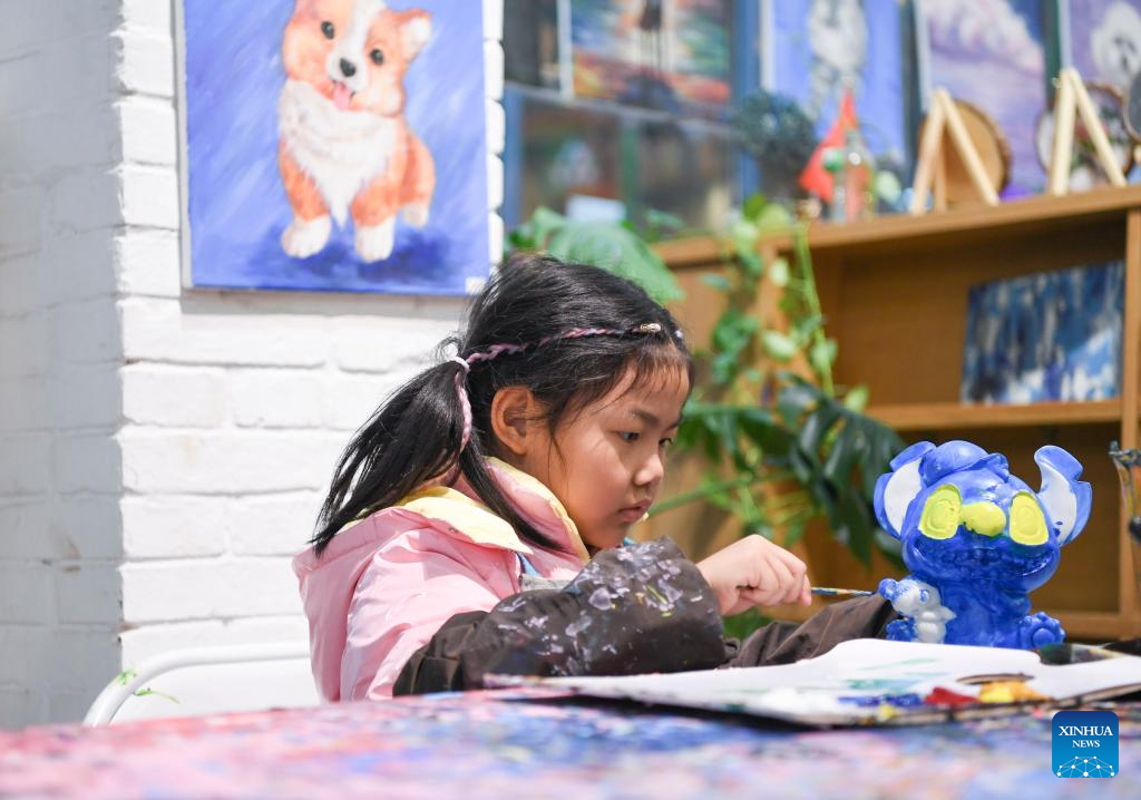 A girl does handwork at the Beicang Cultural and Creative Block in Jiangbei District of southwest China's Chongqing Municipality, Feb. 15, 2024. In recent years, various urban renewal measures have been taken in Chongqing to transform old streets, old factories, old buildings into tourism attractions, the gathering place for emerging industries etc. (Xinhua/Wang Quanchao)