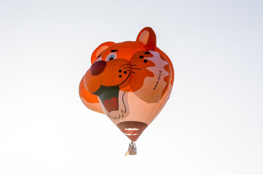A tiger-shaped hot air balloon floats in the sky during the 24th Philippine International Hot Air Balloon Fiesta in Tarlac Province, the Philippines, Feb. 16, 2024. (Xinhua/Rouelle Umali)