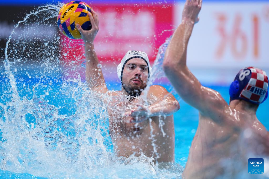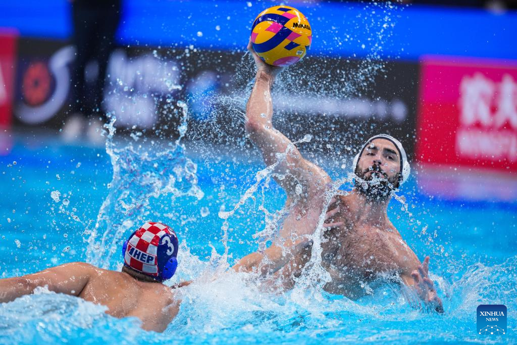 Konstantin Kharkov (R) of Croatia shoots during the men's water polo gold medal match between Italy and Croatia at the World Aquatics Championships 2024 in Doha, Qatar, Feb. 17, 2024. (Xinhua/Du Yu)