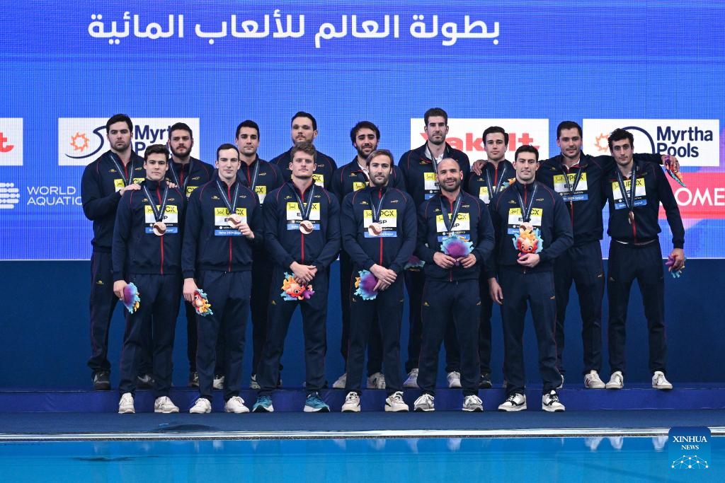 Bronze medalist team Spain pose for photograph during the awarding ceremony for the men's water polo gold medal match between Italy and Croatia at the World Aquatics Championships 2024 in Doha, Qatar, Feb. 17, 2024. (Xinhua/Du Yu)