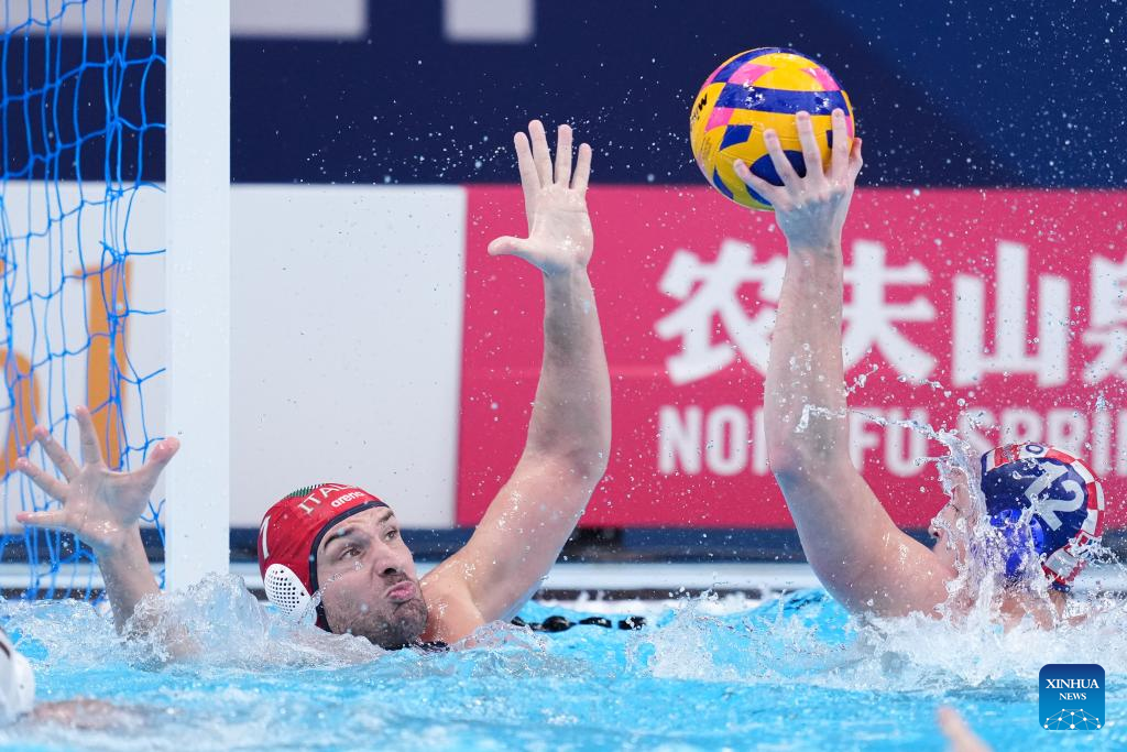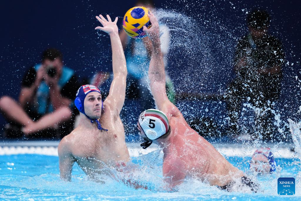 Francesco Di Fulvio (R) of Italy shoots against Loren Fatovic of Croatia during the men's water polo gold medal match between Italy and Croatia at the World Aquatics Championships 2024 in Doha, Qatar, Feb. 17, 2024. (Xinhua/Du Yu)