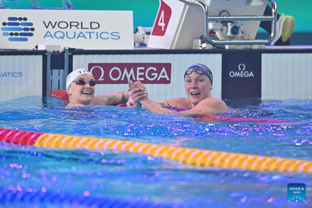 Sarah Sjoestroem (R) of Sweden greets with Melanie Henique of France after the women's 50m butterfly final of swimming event at the World Aquatics Championships 2024 in Doha, Qatar, Feb. 17, 2024. (Xinhua/Xue Yuge)